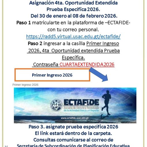Publicada 2 febrero, 2026 Asignación 4ta. oportunidad Extendida. Prueba Específica para Ingresar 2026.Del 30 de enero al 08 de febrero 2026